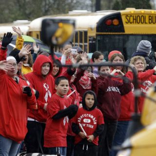 Personas que movían los brazos en señal de buenos deseos, muchas de ellas con velas en las manos, saludaron a estudiantes que regresaban a la secundaria Marysville-Pilchuck luego del tiroteo del 24 de octubre. La gente vitoreaba a medida que los autobuses y automóviles ingresaban a las instalaciones escolares.