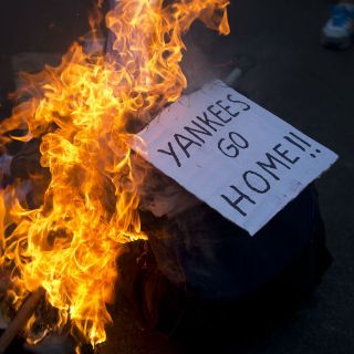Los activistas cantaron consignas contra "el imperialismo yanqui" y quemaron un muñeco que representaba al emblemático Tío Sam norteamericano, sin que se registraran incidentes.