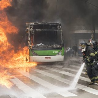 Después de la operación de desahucio del edificio, un autobús urbano fue incendiado esta mañana en la puerta del Teatro Municipal, uno de los edificios más icónicos de Sao Paulo, cerca del edificio desalojado.