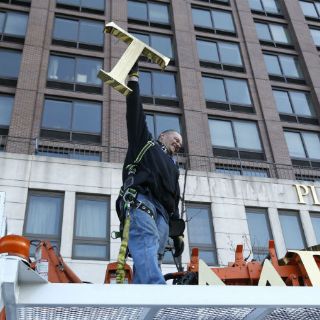 NUEVA YORK, ESTADOS UNIDOS (17/NOV/2016).- Los trabajadores removieron el miércoles las letras doradas de un metro de altura que los distinguía como "Trump Place".