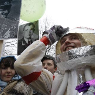 Ayer en Moscú las personas salieron a festejar la hazaña de Gagarin e incluso hubo quienes hicieron sus propios uniformes de astronautas para estar en sintonía con la celebración.