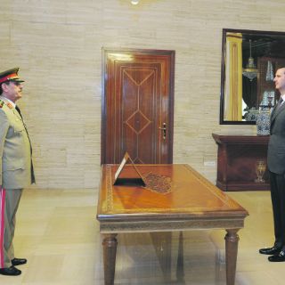 En las imágenes se ve a Al Assad con traje azul recibiendo al nuevo ministro de Defensa, el general Fahd al Freij, con uniforme militar, tras prestar juramento.