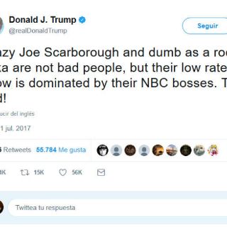 Trump fustigó a Joe Scarborough y Mika Brzezinski del programa Morning Joe a través de Twitter. Desde su club de golf en Nueva Jersey escribió: Loco Joe Scarborough y estúpida Mika no son mala gente, pero su programa de bajo rating es dominado por sus jefes de NBC.