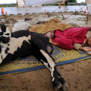 PAKISTÁN (08/AGO/2010).- Una niña pakistaní descansa junto a su oveja en las afueras en un campamento situado en Nowshera.