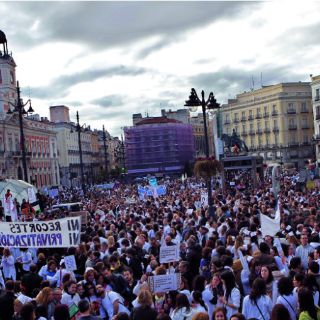 Unas 10 mil personas, muchas de ellas vestidas de blanco, comenzaron a desfilar desde cuatro hospitales importantes en las afueras de la capital rumbo a la céntrica Puerta del Sol con carteles que decían “La sanidad pública no se vende, se defiende”.