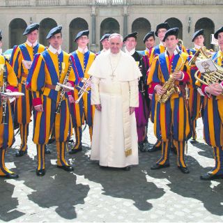 El Papa Francisco celebró el día de su santo, Jorge, con un pastel y un breve concierto que le dedicaron algunos reclutas de la Guardia Suiza Pontificia en el Patio de San Damaso del Palacio Apostólico del Vaticano.
