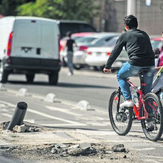Esto se observa sobre Avenida Santa Margarita esquina Magnolias, en la colonia Los Girasoles, donde ya no hay dos bolardos, pero sí hay agujeros, además de una gran piedra de concreto sobre la ciclovía producto de la extracción del pequeño poste, que los ciclistas deben esquivar.