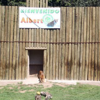 GUADALAJARA, JALISCO (14/SEP/2012).- Con una enorme manta con la leyenda “Bienvenido Albert”, las cámaras de fotos y video, personal del parque, reporteros, así como algunos visitantes apuntando sus miradas a la pequeña puerta de la que será su morada a partir de este viernes; el tigre de bengala, conocido como ''Albert'', por fin pisó vio la luz en un lugar digno de un ejemplar como él: el Zoológico Guadalajara.