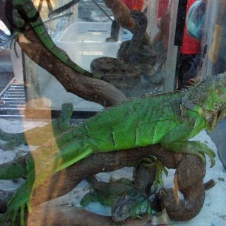 Al lado del erizo, que viene de África, juguetean un par de cuyos que, aunque menos, también son novedad y quien guste, puede tocarlos. Arriba, una pareja de iguanas traídas de El Salvador, ellas se asoman desde un armazón transparente completamente cerrado. Esta clase de animales, él los compra entre sus contactos del Estado.
