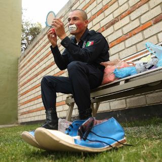 Sus compañeros dan promoción a su trabajo como payaso para aumentar los cuatro mil 500 pesos quincenales que gana como policía, con los que mantiene a su esposa y dos hijos. Apenas alcanzan porque debe pagar un par de préstamos al banco y al Instituto de Pensiones del Estado.