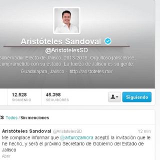 Aristóteles Sandoval escribe en su cuenta @AristotelesSD: “Me complace informar que @arturozamora aceptó la invitación que le he hecho, y será el próximo Secretario de Gobierno del Estado de Jalisco.”