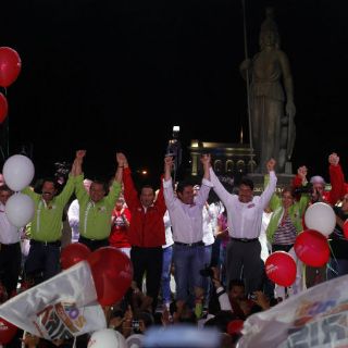 "A partir de mañana empieza una nueva era en Jalisco. Ya llegamos, ya ganamos y vamos a transformar Jalisco", gritó efusivo y todos los priistas alzaron las manos.