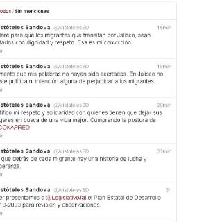 Mediante su cuenta oficial, @aristotelessd publicó: ''Lamento que mis palabras no hayan sido acertadas. En Jalisco no existe política ni intención alguna de perjudicar a los migrantes''.