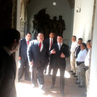 El ahora gobernador caminó dos cuadras para ingresar al inmueble, donde estuvo acompañado de Jorge Carlos Ramírez Marín, Secretario Federal de la Reforma Agraria y quien viajó en representación del Presidente de la República, Enrique Peña Nieto. Ahí, los dos funcionarios estuvieron en el patio central, conocieron el monumento en honor a Guillermo Prieto, que reza la frase legendaria que le salvó la vida a Benito Juárez, y que dice "Los Valientes no asesinan".