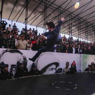 Elementos de Protección Civil y Bomberos del Jalisco realizaron demostraciones de acciones de rescate y unos de esos elementos se acercaron con una malla al gobernador y lo invitaron a saltar.
