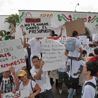 En el lugar de la concentración, el director de la Escuela Politécnica de la UdeG, Luis Robles Villaseñor, explicó a las afueras de Casa Jalisco los motivos por los que el Ejecutivo debe aumentar el presupuesto de la Universidad. Solicitó con un altavoz que el mandatario estatal lo recibiera “cinco minutos” para darle a conocer las necesidades económicas de la UdeG.