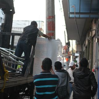 El mobiliario es desmontado para luego ser consignado y trasladado en vehículos oficiales.