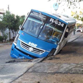 Se explicó que camión al ir circulando cayó al socavón de aproximadamente dos metros de fondo y tres de ancho. No iban pasajeros el urbano de la ruta 634.