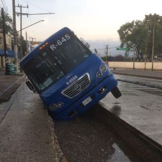 GUADALAJARA, JALISCO (16/JUL/2017).- Una unidad del transporte público de la ruta 645 cayó en una zanja de reparación del Siapa en la calle Gobernador Curiel, en Guadalajara.