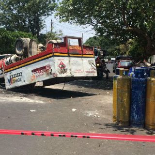 En el lugar, una camioneta tipo pick-up impactó contra una unidad repartidora de gas de la empresa Tomza, misma que quedó volcada sobre su toldo.