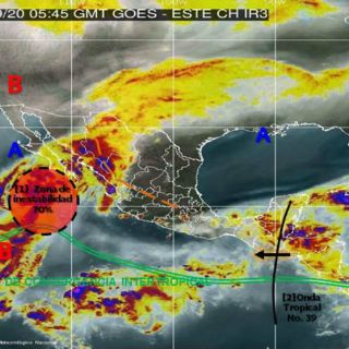 Por otra parte, la zona de inestabilidad del Pacífico mantendrá potencial para desarrollo ciclónico en las próximas horas y estará localizada a menos de 300 kilómetros de Baja California Sur, y mantendrá potencial de lluvias torrenciales en Baja California y Baja California Sur, intensas en Sonora y Sinaloa y muy fuertes en Nayarit, Chihuahua y Durango,