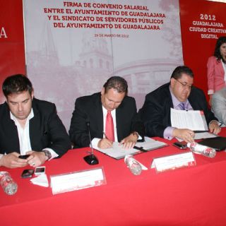 GUADALAJARA, JALISCO (29/MAR/2012).- Quedó debidamente formalizado el acuerdo entre el Ayuntamiento de Guadalajara y su Sindicato de Servidores Públicos, para dar a todos los trabajadores agremiados de la administración municipal un incremento directo al salario de 750 pesos, y un día más de vacaciones al año o, como ellos le llaman: otro día económico.