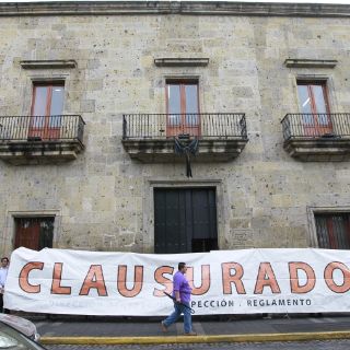 GUADALAJARA, JALISCO (23/JUN/2011).- Un grupo de 20 personas, miembros de diferentes organizaciones civiles, entre las que están Ciudad para Todos y Congreso Ciudadano, acudieron esta mañana al edificio del Congreso de Jalisco, y aunque les negaron el acceso a la totalidad de asistentes, fijaron un posicionamiento en el caso del auditor. Los inconformes colocaron en la fachada del Palacio Legislativo una manta con la leyenda "clausurado".