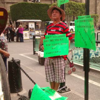 Hasta la tarde de ayer, el señor permanecía descalzo y amarrado con cadenas a un poste sobre avenida Hidalgo, en Plaza Guadalajara, con la convicción de que, hasta que no sea atendido de manera directa por el alcalde, Ramiro Hernández García, no se retirará.