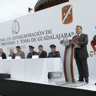 "La Batalla de Orendáin evidencia los ideales sobre los cuales descansan los valores militares fundamentales de nuestro país mismos que se traducen en la protección, defensa, sostenimiento, permanencia y recuperación del orden constitucional", manifestó el secretario General de Gobierno, Arturo Zamora Jiménez, durante la ceremonia realizada en Plaza de Las Américas en Zapopan.