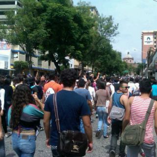 GUADALAJARA, JALISCO (23/AGO/2012).- Divididos en seis contingentes, estudiantes de las preparatorias 7, 17, 12, Norte de Tonalá, Vocacional y Politécnico salieron a las 11:00 horas de Avenida Revolución al cruce con Calzada del Ejército rumbo a Plaza de Armas, como parte de la marcha organizada por la FEU contra el aumento a la tarifa del transporte público.