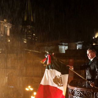 GUADALAJARA, JALISCO (16/SEP/2012).- Sin fuegos pirotécnicos, con una tormenta que no cesó, y una manifestación a los pies de la Plaza de Armas, el gobernador de Jalisco, Emilio González Márquez, dio el Grito de Independencia, el último de su administración.