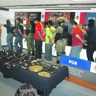 En las instalaciones de la Procuraduría General de la República (PGR) fueron presentados 11 hombres y dos mujeres, a quienes les aseguraron siete fusiles de asalto, cuatro pistolas, dos granadas de fragmentación y 650 balas, además de 76 mil 425 pesos, tres automotores y 15 teléfonos celulares.