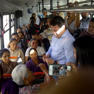 Cercanas las 10 de la mañana, fue momento de subir a la ruta 275F. La unidad llevaba prácticamente todos los asientos ocupados, así que después de pagar el pasaje, uno a uno de los que acompañaban al mandatario fueron acomodándose de pie. El llevar al gobernador como pasajero no evitó de ninguna manera que el camionero pidiera que se recorriera para atrás. No le quedó de otra que atender la petición.
