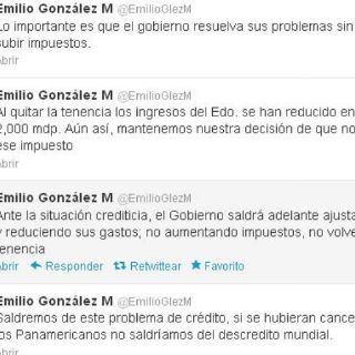 "Saldremos de este problema de crédito, si se hubieran cancelado los Panamericanos, no saldríamos del descrédito mundial" fue el primer mensaje que envió González Márquez. Continuó "Ante la situación crediticia, el Gobierno saldrá adelante ajustando y reduciendo sus gastos; no aumentando impuestos, no volverá la tenencia". Por último publicó "Al quitar la tenencia de los ingresos del estado, se han reducido en 2,000 millones de pesos. Aún así, mantenemos nuestra decisión de que no vuelva ese impuesto", dijo el mandatario en su mensaje por medio de la red social.