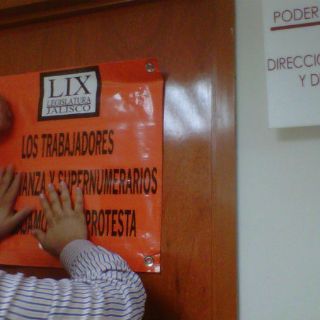 GUADALAJARA, JALISCO (10/OCT/2012).- Un grupo de trabajadores del Congreso local colocaron mantas en la puerta de la Dirección Jurídica del Poder Legislativo con la leyenda: "Los trabajadores de confianza y supernumerarios trabajamos bajo protesta".
