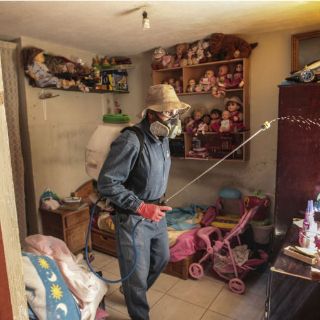 Jonathan da instrucciones a los vecinos. Se coloca sus arreos de trabajo y empieza a fumigar paredes, puertas, sitios oscuros; todos los lugares quedan impregnados con el olor del químico. El empleado dice tener ocho meses con ese trabajo, y le gusta porque previene enfermedades.