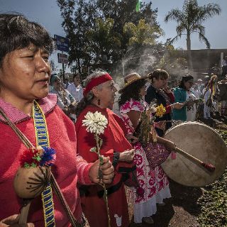 Avanzan los minutos y los participantes comienzan a tomar sus posiciones; los tambores retumban con mayor intensidad, arrancan con cantos, algunos de ellos para la Guadalupana, todo esto ante la mirada cómplice de la gente, de tres policías, dos paramédicos y cuatro perros que merodean la zona. Las sanadoras, con sus pequeños ahumadores que queman copal y flores de santa maría comienzan a purificar a la gente, mujeres y niños los primeros en hacer esto, los hombres, simplemente mirando.