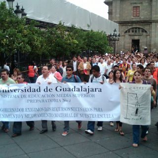 Esta mañana, estudiantes de las preparatorias 2 y 3 de la UdeG, acompañados por algunos maestros de esos planteles, arribaron aproximadamente a las 10:15 horas a la Plaza de Armas para exigir al Gobierno del Estado mayor presupuesto.