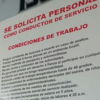 En este póster que se ha colocado al interior de los camiones se despliega un listado de las complicadas condiciones de trabajo a las que se enfrentan todos los días los choferes. Entre los puntos destaca: El peligro de muerte en caso de asaltos, el maltrato de los pasajeros, acoso de los medios y falta de reconocimiento a su servicio.
