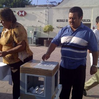 Los integrantes de la casilla piden la credencial del IFE y la gente recibe una boleta que dice "¿Apruebas el trabajo de Enrique Alfaro?". Luego se meten en la mampara para marcar la boleta y finalmente la depositan en la urna.