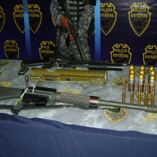 Tras su captura, la Policía estatal les aseguró un gran arsenal, además de más de 200 kilogramos de metanfetaminas, 40 kilos de mariguana y cinco vehículos.