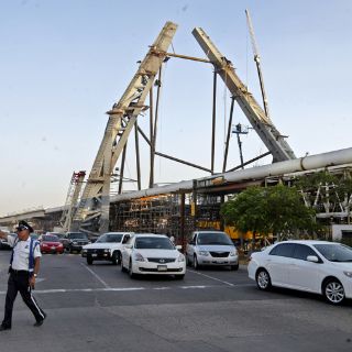 Los carriles se cierran, en su sentido de circulación del Mercado de Abastos a la Gran Plaza, para montar la estructura metálica (pilones) que sostendrá los cables de la parte colgante del Puente Matute Remus o también conocido como Atirantado.