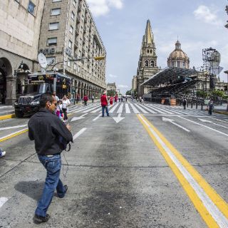 Al cruzar Liceo, en la única banqueta que las vallas negras dejaron libre, el carrito se atora entre un bote de basura y un escalón de los portales que están frente a la Rotonda de los Jaliscienses Ilustres. José Manuel pide ayuda a un policía estatal que está parado frente a la estatua de Clemente Aguirre: