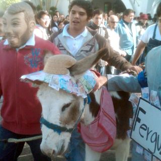 Estaba adornado con un sombrero, mascada y billetes de juguete, y era acompañado por un estudiante vestido como el dictador alemán Adolfo Hitler quien portaba una cartulina con la leyenda “Ferguz”, en alusión al secretario general de Gobierno, Fernando Guzmán Pérez Peláez.