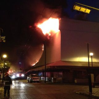 Elementos de Protección Civil trabajan para sofocar el incendio. Informan que existe el riesgo de que exploten tanques del gas del inmueble, por eso tomaron como medida de protección el desalojo de las calles Independencia a Hidalgo y dos cuadras a la redonda.