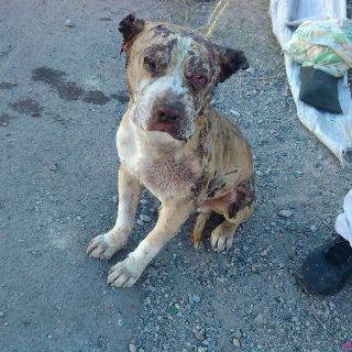 "Kadafi" (nombre del perro) con fuertes quemaduras en el rostro y distintas partes de su cuerpo.