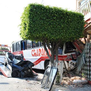 Según las autoridades estatales y municipales, un camión de pasajeros de la línea Chapala, con placas 391HTS, viajaba por la calle Violeta, cuando impactó de frente a un Chevy, en color azul, con la matrícula de circulación JA-9289, arrastrándolo al menos 30 metros para terminar estrellados en contra de una casa que sufrió severos daños en dos habitaciones, una ubicada en plata baja y otra en plata alta de ésta.