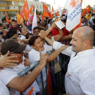 6:55 de la tarde y los dos contingentes se encontraron en un lugar emblemático. Realizaron un alto total a los pies del Ayuntamiento de Guadalajara, donde hace menos de tres meses despachaba Aristóteles Sandoval, el rival a vencer. Pocos lo recordaron: los contingentes solo gritaban "¡ya llegó, ya está aquí, el que va a chin... al PRI!".