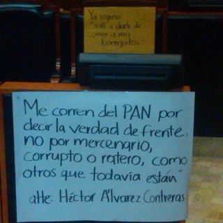 En otra leyenda que colocó en una cartulina blanca en la curul dice: “Me corren del PAN por decir la verdad de frente, no por mercenario corrupto o ratero, como otros que todavía están. Atte.; Héctor Álvarez Contreras”.