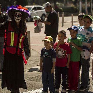 Desde la Secretaría de Educación Jalisco, en conjunto con Comude, se realizan actividades recreativas con niños. Una de las colaboradoras es Karely Montaño que tiene un año trabajando en la Vía, pero el domingo tres de noviembre es especial, dejó los tenis y el pantalón de mezclilla por unos tacones elegantes, un vestido negro y pintura para caracterizarse de La Catrina.